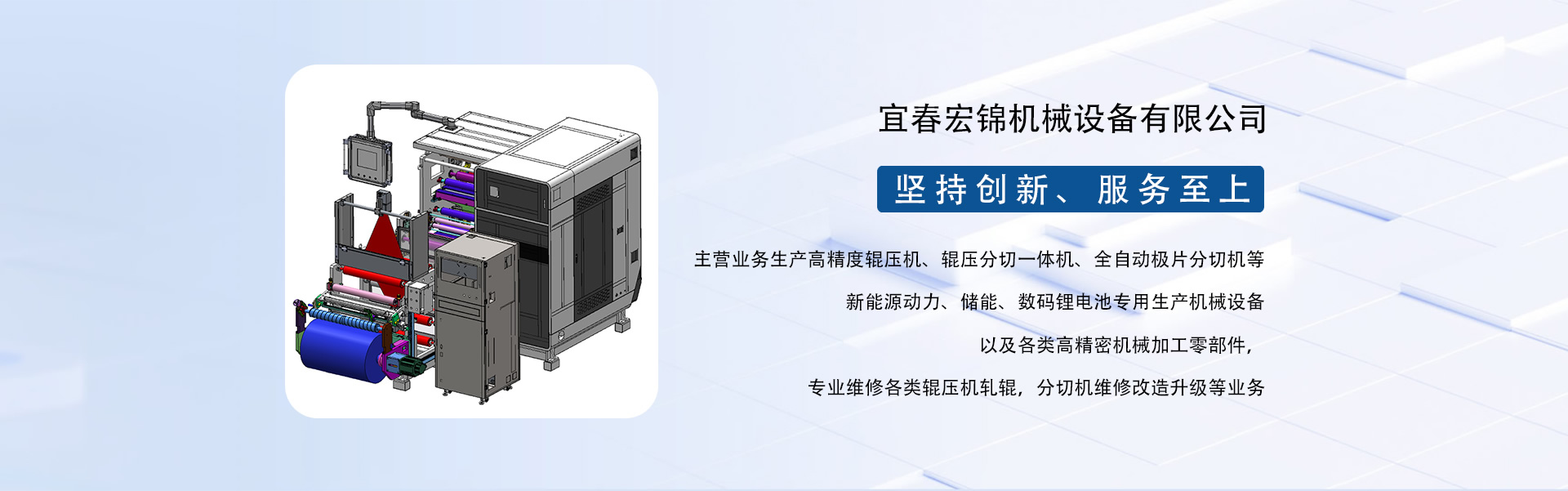 東莞市宏錦機(jī)械科技有限公司江西分公司是一家集研發(fā)、生產(chǎn)、銷(xiāo)售、服務(wù)于一體的創(chuàng)新型鋰電自動(dòng)化精密機(jī)械設(shè)備專(zhuān)業(yè)制造、服務(wù)商,坐落于江西省新余市渝水區(qū)新余經(jīng)濟(jì)開(kāi)發(fā)區(qū)孵化園5號(hào)廠房,廠房面積近6000平米,由東莞市宏錦機(jī)械科技有限公司于2024年11月投資新建,交通區(qū)位優(yōu)勢(shì)明顯、產(chǎn)業(yè)配套便捷集中,擁有一批具有行業(yè)豐富經(jīng)驗(yàn)的技術(shù)人員和管理團(tuán)隊(duì)。公司主營(yíng)業(yè)務(wù)生產(chǎn)高精度輥壓機(jī)、輥壓分切一體機(jī)、全自動(dòng)極片分切機(jī)等新能源動(dòng)力、儲(chǔ)能、數(shù)碼鋰電池專(zhuān)用生產(chǎn)機(jī)械設(shè)備以及各類(lèi)高精密機(jī)械加工零部件,專(zhuān)業(yè)維修各類(lèi)輥壓機(jī)軋輥,分切機(jī)維修改造升級(jí)等業(yè)務(wù)。根據(jù)公司發(fā)展三步走戰(zhàn)略規(guī)劃經(jīng)營(yíng)現(xiàn)下設(shè)三個(gè)二級(jí)獨(dú)立運(yùn)營(yíng)事業(yè)部分別為分切事業(yè)部(分切機(jī)、輥壓分切一體機(jī))、磨輥事業(yè)部(輥壓機(jī)、軋輥修磨)、機(jī)加事業(yè)部(精密機(jī)械部件加工)。經(jīng)過(guò)十余年沉淀發(fā)展主要客戶(hù)有新余贛鋒、南昌維科、宜春清陶、云南路華、河南恒一、江西程疆、四川天萊、蕪湖天弋、惠州億緯鋰能、無(wú)錫盤(pán)古新能源、鄭州比克、安徽鋰天下、臺(tái)灣長(zhǎng)利(宏基集團(tuán))、重慶維都利(紫建電子)、贛州諾威、安徽利維能、漳州萬(wàn)寶、重慶佳寶成、廣西皇冠儲(chǔ)能等一批具有行業(yè)知名度和影響力的企業(yè)。公司在新能源發(fā)展的道路上堅(jiān)持創(chuàng)新,為客戶(hù)帶來(lái)穩(wěn)定、高效的自動(dòng)化專(zhuān)用設(shè)備和更大的收益。